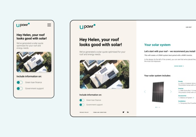 I have worked with uPowr to develop the UI and visual design of this data-driven platform, that delivers a modern, digital customer experience and a new way to get solar and batteries installed. The platform generates personalised quotes to match the customer’s energy needs. Upowr has built tools to understand the customer’s home – it’s…